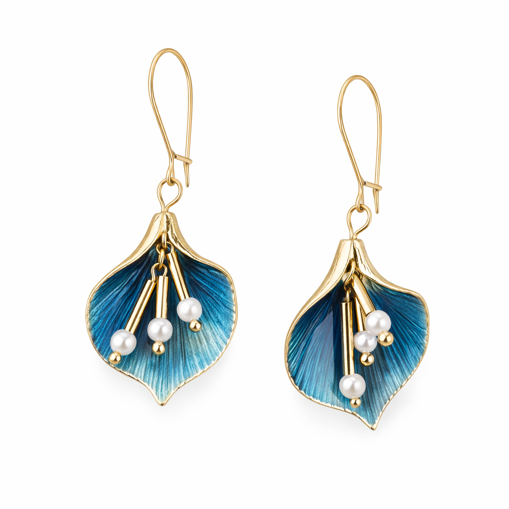 Gold Blue Lily Drop Earrings with Pearls