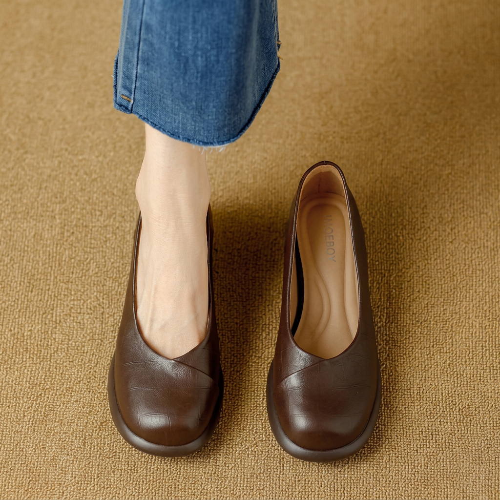 Cut from rich, textured leather, these pumps rest on a thick sole for solid footing. The cylindrical block heel adds stable height, making them an easy choice for all-day wear. A distinct diagonal seam across the vamp gives the simple silhouette a tailored finish.
