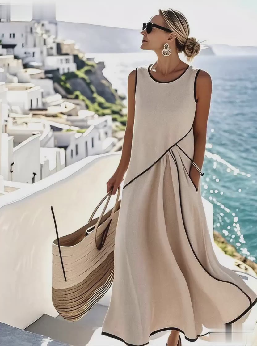 Beżowa sukienka bez rękawów z eleganckimi plisami