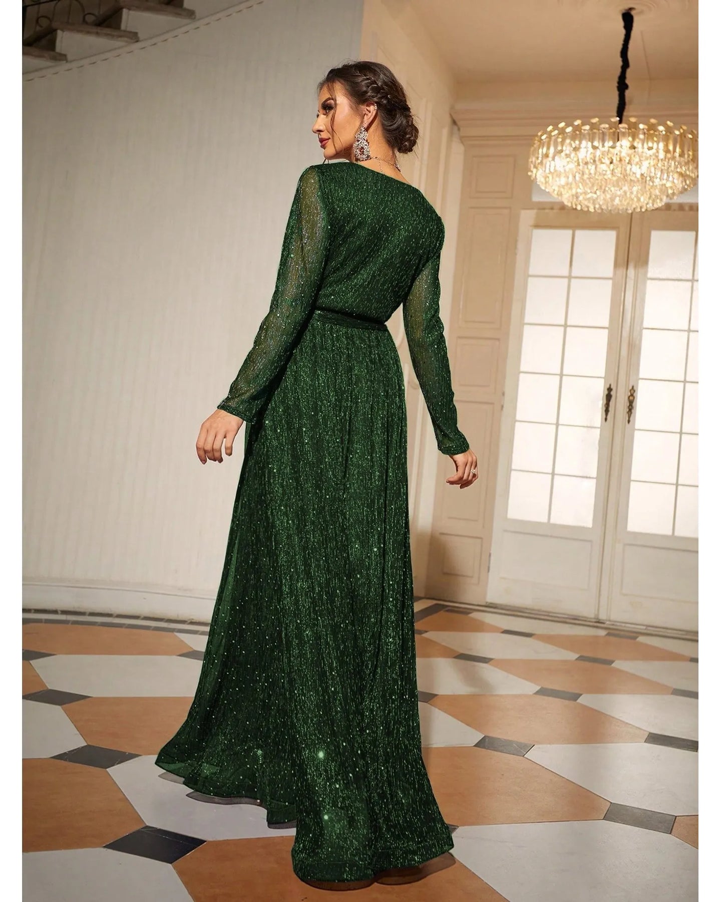Sukienka Eliza™ w Głębokiej Zieleni to prawdziwy hit. Ta długa sukienka z długimi rękawami w głębokim soulonym kolorze jest bogato zdobiona błyszczącymi cekinami i ma głęboki dekolt w kształcie litery V, co nadaje jej elegancki, tajemniczy urok.
